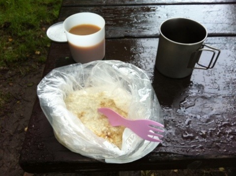 Had a good night at the site, it rained overnight but stopped before I got up for breakfast. Tried out “instant porridge in a bag” – making it in a mug is OK but then cleaning out the gloopy porridge afterwards is a chore. So my solution was put the instant oat breakfast, dried milk and sugar in a poly bag, and then use that as the bowl – and it was a success. Dirty bag in the bin afterwards.