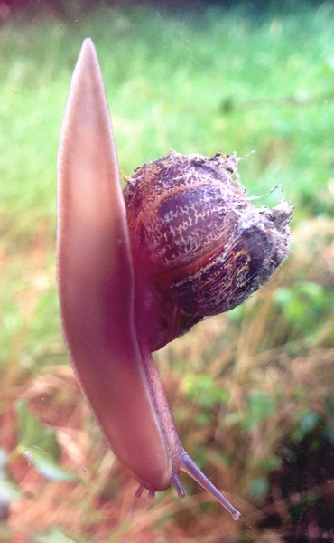 I noticed this snail making its way down the patio window this morning.